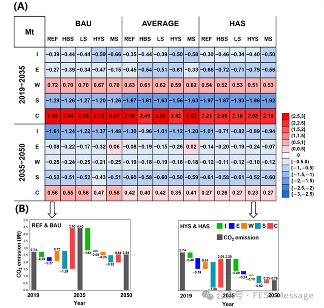 图4 (A)碳排放变化驱动因素;(B)REF&BAU情景与HYS&HAS情景下的驱动因素。图(A)中,红色方块表示排放增加,蓝色方块表示排放减少;方块内数字表示各驱动因素导致的碳排放变化量(单位:Mt)。I:排放强度效应;E:节能效应;W:航道优化效应;S:船舶大型化效应;C:货运发展效应。
