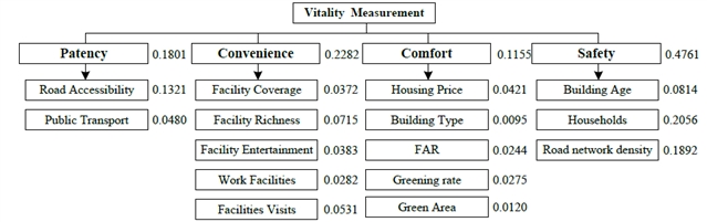 构建评价体系——聚焦“人”的需求,构建科学评估体系:传统的社区评价多依赖问卷调查,样本有限且主观性强。本研究结合更新核心要素,即从“社会可持续性”(Socially Sustainable Perspective, SSP)出发,将社区质量拆解为居民最关心的四大维度:便捷(Patency)、便利(Convenience)、舒适(Comfort)和安全(Safety)。这四大维度,精准对应了居民对“出行是否顺畅”、“生活是否方便”、“居住是否舒适”、“环境是否安心”的核心诉求。为了科学确定这些指标的“重要程度”,研究团队采用层次分析法(AHP) 进行了权重赋值,确保了评估模型的科学性和权威性(图2)。