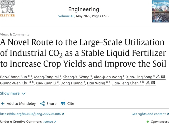 Bao-Chang Sun, Meng-Tong Mi, Sheng-Yi Wang, Xiao-Juan Wang, Xiao-Ling Song, Guang-Wen Chu, Xue-Kuan Li, Dong Huang, Dan Wang, Jian-Feng Chen. A Novel Route to the Large-Scale Utilization of Industrial CO2 as a Stable Liquid Fertilizer to Increase Crop Yields and Improve the Soil. Engineering 2025;48:12–15. DOI: 10.1016/j.eng.2025.03.006.