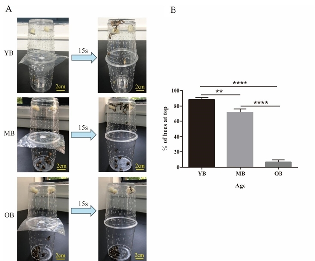 实验结果显示 (图2),青年和中年蜜蜂在饥饿条件下能够快速爬行或飞到喂食平台的比例显著高于老年蜜蜂。只有6.7%的老年蜜蜂能够在15秒内到达喂食平台,表明其运动能力显著下降。这种运动能力的下降可能会限制蜜蜂的觅食范围和效率,进而影响蜂群的生产力。