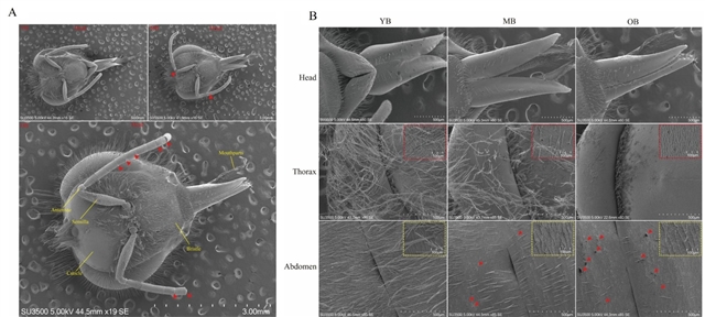图3.不同年龄工蜂体表结构特征的扫描电镜观察