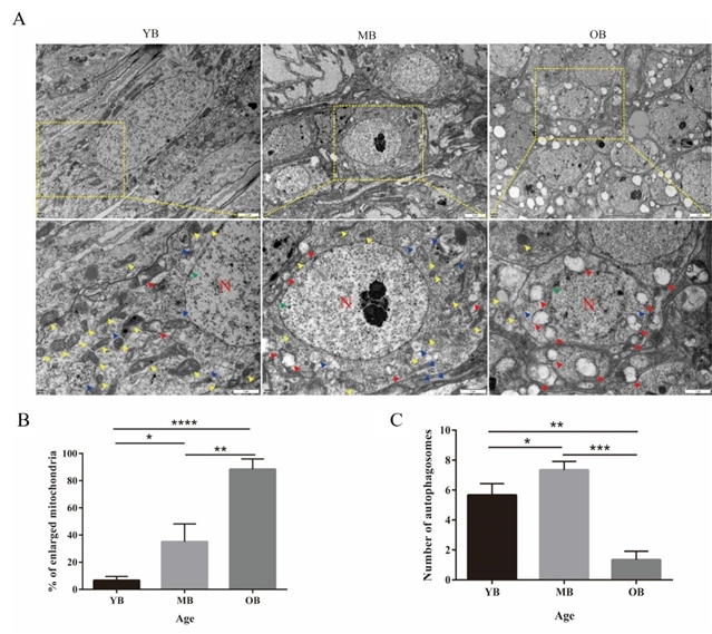 图4. 不同年龄工蜂头部组织超微结构特征的透射电镜观察