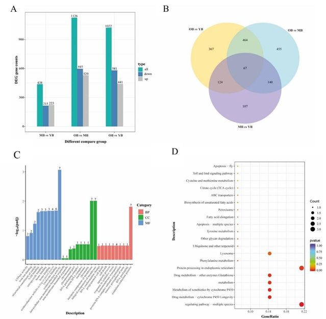 图5.不同年龄工蜂差异表达基因的筛选及功能富集分析