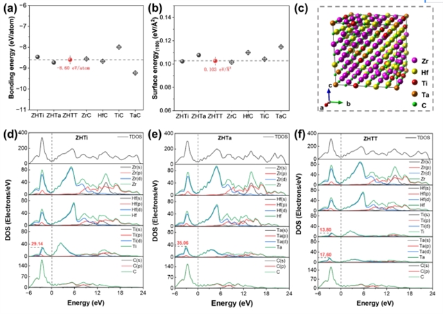图5 ZHTi、ZHTa 与 ZHTT的稳定性计算:(a) 结合能;(b)(100)表面能;(c) 3×3×3 超胞;(d) ZHTi 的态密度(DOS)分析;(e) ZHTa 的DOS分析;(f) ZHTT 的DOS分析。