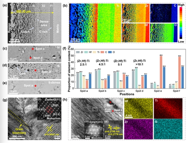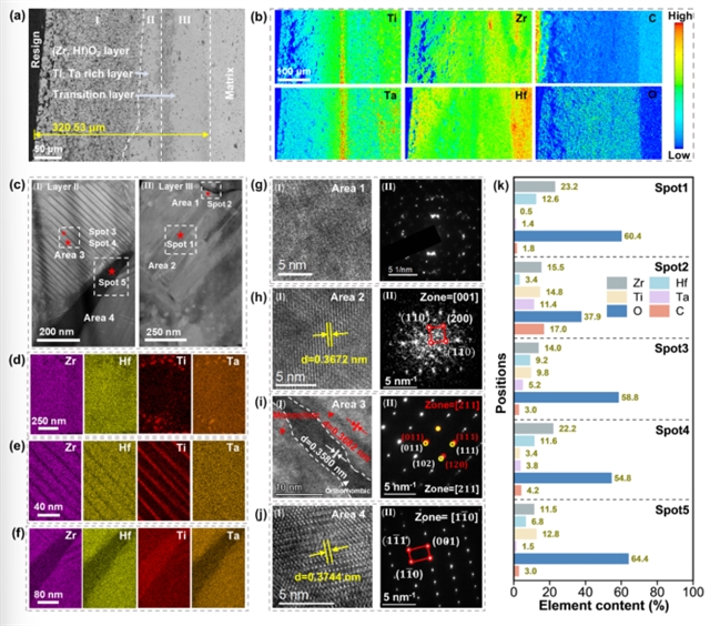 ZHTT的氧化层呈三层连续结构:外层为(Zr, Hf)O?,中间为Ti-Ta富集层,内层为过渡层。该陶瓷结合了ZHTi与ZHTa的优点:Ti与Ta协同扩散有效抑制了裂纹与孔隙的产生,实现了氧化层自修复;Ta基低挥发氧化物使得内层过渡区形成的“高熔点骨架+低熔点填充相”的复合结构具有较高的稳定性,大幅度降低了基体的损耗率。因此,ZHTT通过元素协同实现了抗烧蚀性能的突破性提升。