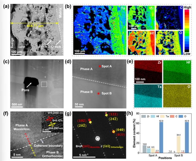 ZHTa的氧化层呈双层结构:含Hf6Ta2O17的(Zr, Hf)O2层和致密Ta富集层。在富Ta层中,Ta2O5的低挥发性和低熔点特性使其能在高温烧蚀中有效修复孔隙,大幅度降低氧扩散速率,使得ZHTa基体具有最低的损失率。冷却时,m-(Zr, Hf)O2与β- Ta2O5通过异质成核形成晶格失配仅0.12%的有序界面,抑制微裂纹产生。然而,Ta2O5的低挥发特性也导致其无法实现有效的自修复,使得ZHTa表层氧化层出现烧蚀坑和宏观孔隙。