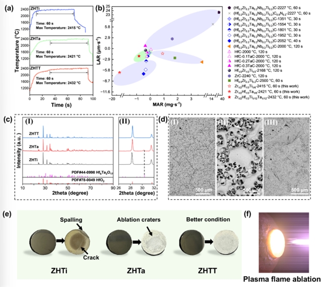 图1 ZHTi、ZHTa和ZHTT的烧蚀性能:(a)烧蚀温度曲线;(b)质量损失率和线性烧蚀率;(c)I:烧蚀后不同陶瓷表面的XRD图谱,II:局部放大图像;(d)烧蚀后陶瓷烧蚀中心微观结构,I:ZHTi,II:ZHTa,III:ZHTT;(e)烧蚀前后陶瓷的宏观形貌;(f)等离子烧蚀示意图。