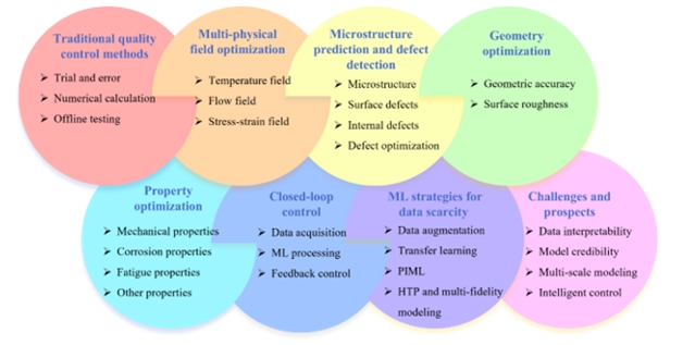 (2)桥接基础物理场与最终零件质量,阐明ML驱动的质量优化新机制。明确地搭建了基础物理场与最终零件质量属性之间的桥梁,详细讨论了如何利用机器学习对物理机理的洞察来优化关键质量属性(如缺陷抑制、几何保真度、材料性能调控),系统阐明了基于机器学习的多物理场预测/控制与最终质量优化之间的关联机制。
