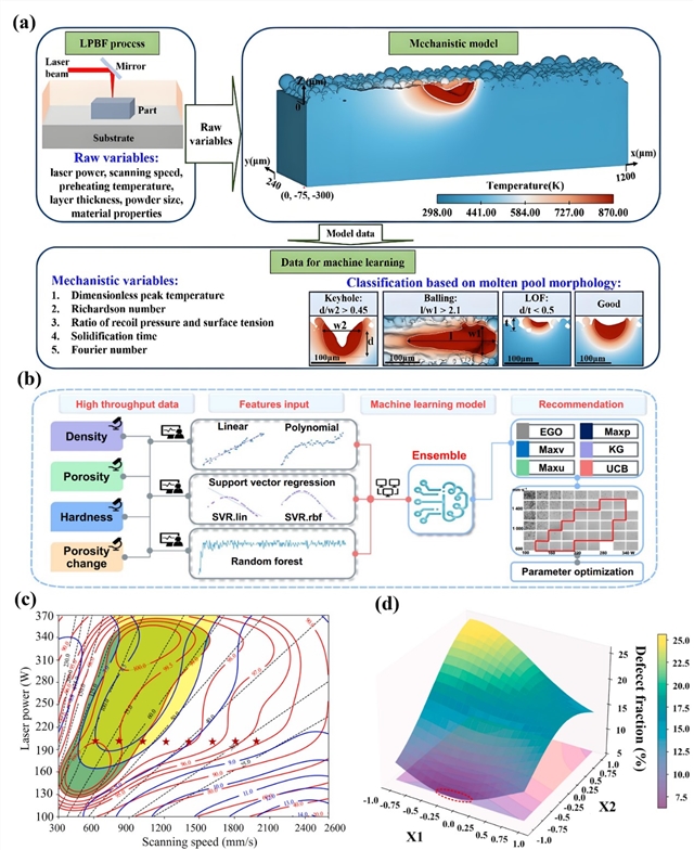 图 4 (a) 利用PIML、LPBF参数的优化将未熔合缺陷减少到最低水平;(b) ML过程和ML引导优化的示意图;(c) GPR模型预测的激光功率和扫描速度工艺窗口;(d) GPR预测的缺陷率平均值的响应面。