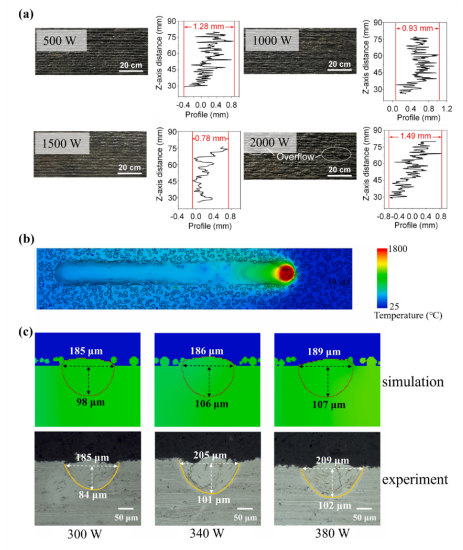 图 2(a)不同功率下增材制造的SS316L表面粗糙度变化;(b)激光功率为340 W、焊接速度为1500 mm/s时焊池中的热分布;(c)不同功率下模拟熔池与实验形成的熔池横向视图特征比较。