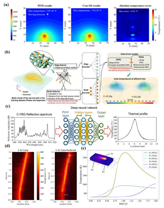 图 3 (a)利用Conv1D模型进行等离子弧AM的温度场预测和FEM仿真结果;(b)用于DED快速温度预测的数据驱动模型框架和图形样本;(c)C光纤布拉格光栅热解调的机器学习流程;(d)校准实验与机器学习解调的地下热剖面比较;(e)激光熔融沉积(LMD)过程中代表性点的预测与模拟热历史比较。