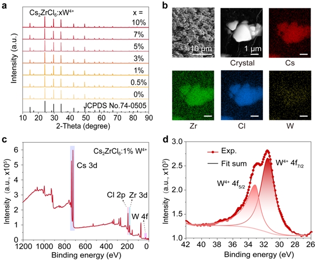 图2. Cs2ZrCl6:W4+的相与晶体结构:(a) 不同W4+掺杂浓度下Cs2ZrCl6荧光粉的PXRD图谱;(b) Cs2ZrCl6:1%W4+的SEM图像及元素分布图;(c) Cs2ZrCl6:1%W4+的XPS全谱图;(d) W的高分辨XPS 4f谱图。