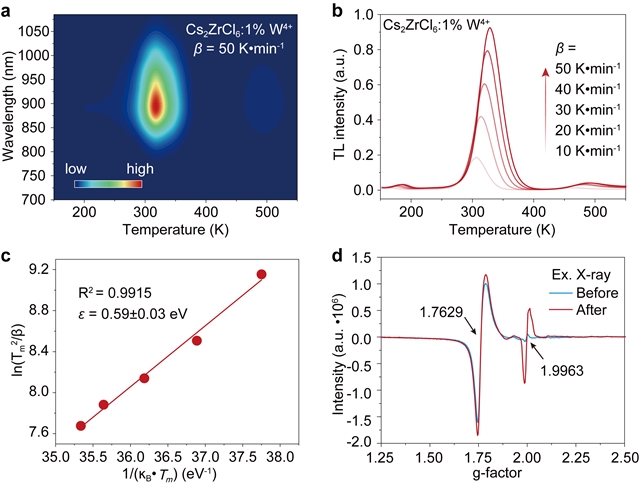 图4 Cs2ZrCl6:W4+的陷阱分析:(a) 加热速率 50 K·min-1下的温度依赖热释光(TL)等高线图;(b) 不同加热速率(10、20、30、40、50 K·min-1)的 TL 曲线。荧光粉在 150 K下先经 X 射线激发5分钟;(c) 基于 Randall-Wilkins 模型对陷阱深度的估算;(d) Cs2ZrCl6:W4+在X射线激发(50 kV,160 μA)5分钟前后的ESR图谱,测试温度为100 K。