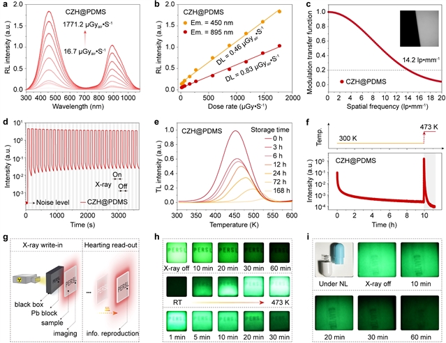 图6. CZH@PDMS薄膜的X射线发光扩展成像应用:(a) 不同 X射线辐射剂量率下CZH@PDMS薄膜的RL光谱;(b) 跨越不同辐射剂量率的X射线响应信噪比及 CZH@PDMS 薄膜光谱的检测限;(c) X射线成像的调制传递函数(MTF);(d) 剂量率为 9 mGyair·s-1下,连续30次开/关循环记录的CZH@PDMS薄膜RL强度;(e) 在加热速率50 K·min-1下的TL曲线,样品先经X射线激发(50 kV,160 μA),再在室温黑暗环境中存储不同时间(0–168小时);(f) 在不同热刺激条件下的长余辉衰减曲线。先将X射线激发后的CZH@PDMS 薄膜在室温下放置10小时,再以150 K·min-1的加热速率加热至200 °C;(g) X射线发光扩展成像示意图:通过X射线写入,再利用热能读出;(h–i) X射线发光扩展成像应用的照片:(h) 黑箱中“P-E-R-S-L”铅字;(i) 胶囊中封装的金属弹簧,在50 kV、160 μA X射线激发下的成像。