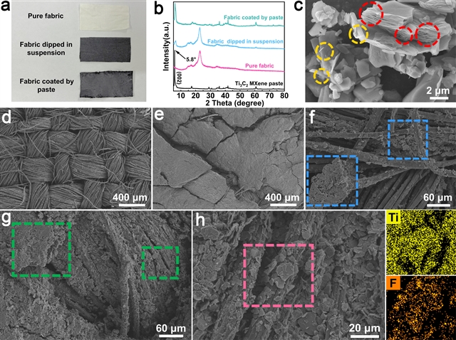 图2(a)原始织物,浸渍了MXene悬浮液的织物,旋涂有MXene粘膏织物的光学图像;(b)MXene粘膏粉末,原始织物,浸渍了MXene悬浮液的织物和旋涂有MXene粘膏织物的XRD图谱;(c)MXene粘膏粉末的扫描电镜图像;(d)浸渍了MXene悬浮液的织物和(e)旋涂有MXene粘膏织物的SEM图像;(f)浸渍了MXene悬浮液的织物和(g)旋涂有MXene粘膏织物的高倍SEM图像;(h)旋涂有MXene粘膏织物的SEM图像以及相应的EDS元素图谱(Ti和F)。