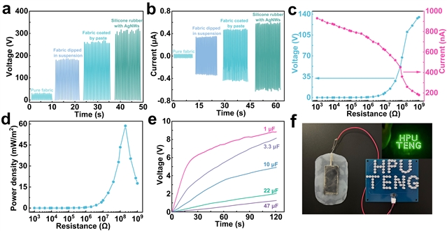 图3(a)不同织物导电层和橡胶表面进一步旋涂AgNWs的TENG的开路电压和(b)短路电流;(c)TENG在不同外部负载下的开路电压、短路电流和(d)功率密度;(e)TENG在不同电容容量下的充电能力;(f)用手按压TENG,点亮由78个串联LED灯组成的“HPU TENG”字样