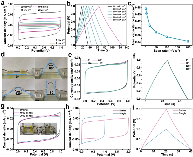 图4 基于石墨烯电极MSC的电化学性能表征;(a)MSC在不同扫描速率下的循环伏安(CV)曲线;(b)MSC在不同电流密度下的恒流充放电(GCD)曲线;(c)MSC在不同扫描速率下的面积比电容;(d)柔性MSC在0°-180°弯曲范围内的光学图像;(e)不同弯曲角度下MSC在100 mV s-1的扫描速率下的CV曲线;(f)不同弯曲角度下MSC在0.01 mA cm-2电流密度下的GCD曲线;(g)在100 mV s-1的扫描速率下,MSC经过2000次弯曲循环后的CV曲线对比; MSC串联连接后的(h)CV曲线和(i)GCD曲线