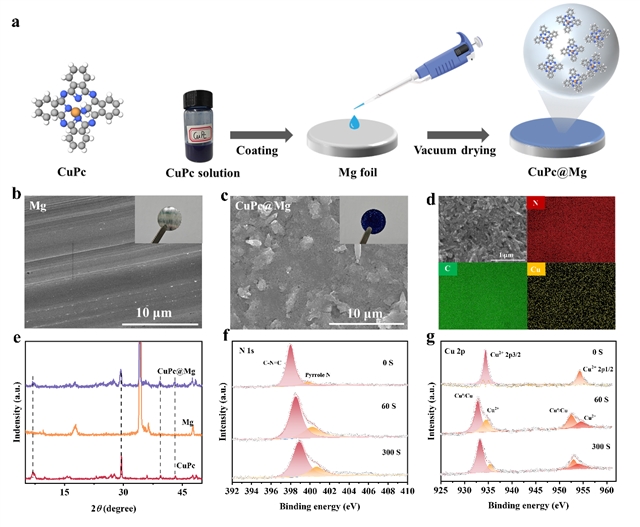 图 1.(a)CuPc@Mg阳极的制备工艺。(b)裸Mg和(c)CuPc@Mg的SEM图像。(d)高倍率SEM图像和相应的N(红色)、C(绿色)和Cu(黄色)元素映射。(e)原始CuPc粉末、Mg和CuPc@Mg的XRD光谱。(f)CuPc界面层的N 1s和(g)Cu 2p XPS光谱。