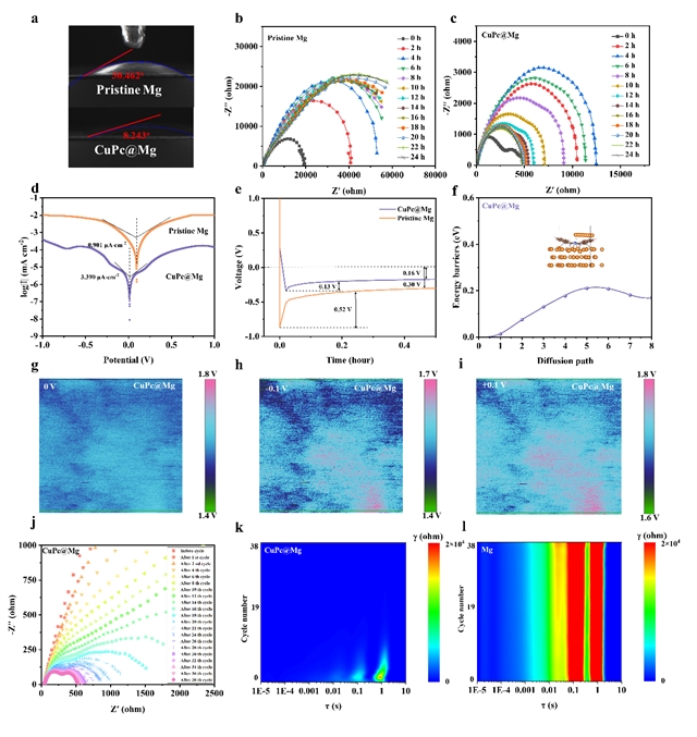 图 2.(a)APC电解液在裸Mg和CuPc@Mg阳极上的接触角。(b)裸Mg和(c)CuPc@Mg阳极的对称电池在不同静置时间的的EIS图。(d)裸镁和CuPc@Mg阳极的Tafel测试。(e)裸Mg和CuPc@Mg 阳极的成核过电位。(f)Mg2+扩散途径和扩散能垒。(g-i)CuPc@Mg阳极的KPFM测试。(j)CuPc@Mg阳极组装的对称电池的原位EIS。(k)CuPc@Mg和(l)Mg阳极的相应DRT结果的等高线图。