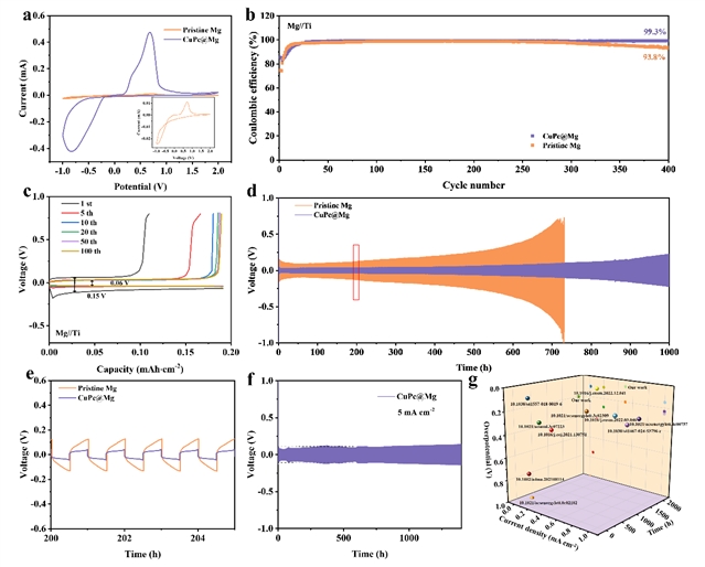图 3.(a)裸Mg和CuPc@Mg阳极的CV曲线。(b)Mg||Ti不对称电池库仑效率和(c)容量-电压曲线。(d)对称电池的循环性能和(e)200-205圈放大的时间-电压曲线。(f)CuPc@Mg阳极的对称电池在5.0 mA cm-2的循环性能。(g)文献中报道的对称电池的过电位、电流密度和寿命的比较。