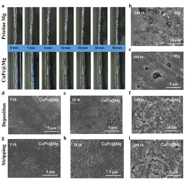图 4.(a)裸Mg和CuPc@Mg阳极在5 mA cm-2下的Mg电镀过程的原位显微镜图像。(b、c)裸Mg不同循环后的SEM图像。CuPc@Mg阳极在不同循环后的沉积态(d-f)和剥离态(g-i)的SEM图像。