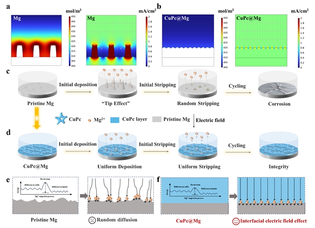 3.通过建模仿真直观证实,CuPc修饰层可均匀化电极/电解质界面电场,引导镁离子均匀扩散与沉积,提升电池安全性。