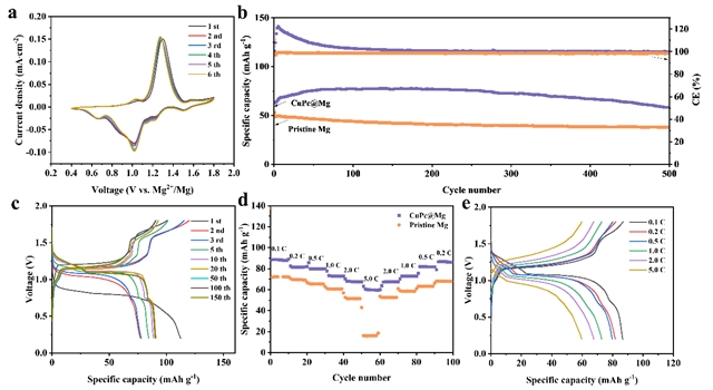 图6.全电池的性能比较。(a)CuPc@Mg||Mo6S8电池CV曲线。(b)CuPc@Mg||Mo6S8和Mg||Mo6S8电池的长循环测试。(c)CuPc@Mg||Mo6S8电池不同循环圈数的容量-电压曲线。(d)倍率性能测试。(e)CuPc@Mg||Mo6S8电池不同倍率下的容量-电压曲线。