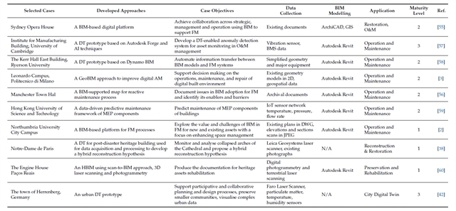 其中,悉尼歌剧院使用基于BIM的数字平台,使用ArchiCAD和GIS,通过创建统一中央数据存储库和集成建筑模型支持设施管理,成熟度2级;剑桥大学制造研究所大楼,是基于Autodesk Forge和AI技术的数字孪生原型,集成振动传感器和BMS数据,实现资产异常检测,成熟度3级;瑞尔森大学Kerr Hall东楼,是基于Dynamo BIM的数字孪生原型,使用简化几何形状和主要设备数据,自动化BIM模型与设施管理系统间的信息传输,成熟度2级;米兰理工大学Leonardo校区,采用GeoBIM方法结合GIS和BIM,使用现有2D几何模型和地理空间数据,支持数字建筑环境的运营维护决策,成熟度2级;曼彻斯特市政厅,BIM支持地图用于设施管理流程,基于档案文件,研究从传统设施管理向BIM-FM过渡的挑战和推动因素,成熟度2级;香港科技大学,机电设备数据驱动预测性维护框架,使用IoT传感器网络(温度、压力、流量),集成BIM和IoT技术,成熟度2级;诺桑比亚大学城市校区,将BIM平台用于设施管理,基于DWG平面图和JPEG扫描件,探索BIM在新旧资产设施管理中的价值,成熟度2级;巴黎圣母院,采用灾后遗产建筑数字孪生技术,使用激光扫描仪和现有照片,监控分析坍塌拱顶并提出重建假设,成熟度1级;帕索斯雷伊斯引擎楼,使用scan-to-BIM方法和HBIM工作流程,基于数字摄影测量和地面激光扫描,为遗产资产修复制作文档,成熟度1级;德国赫伦贝格镇,为城市数字孪生原型,使用Faro激光扫描仪和环境传感器,支持参与式城市规划设计和复杂城市数据可视化,成熟度3级。
