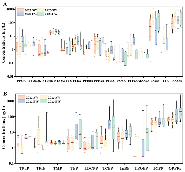 新兴污染物(CECs),包括全氟和多氟烷基化合物(PFASs)和有机磷酸酯阻燃剂(OPFRs),由于其持久性、生物累积潜力和毒性而引起了全球关注。本研究全面调查了中国长江上游地表水中18种PFASs和9种OPFRs的存在、时空分布、潜在来源及其生态和人类健康风险。水样采集于2022年和2023年,取自长江干流和五条主要支流(岷江、金沙江、沱江、嘉陵江和乌江)。PFASs和OPFRs的总浓度分别为16.07至927.19 ng/L和17.36至190.42 ng/L,干流中的浓度始终高于支流。超短链全氟烷基化合物(PFASs)(例如TFMS)和卤代有机阻燃剂(OPFRs)(例如TCPP)是主要化合物,可能源自工业排放、废水排放物和其他人为污染源。生态风险评估表明,大多数采样点的风险为低至中等,废水排放点附近的风险较高。人体健康风险评估表明,非致癌风险可忽略不计,但发现特定地区(尤其是乐山市)成人接触OPFRs存在潜在的致癌风险。本研究强调了了解长江上游PFASs和OPFRs的命运和影响的重要性,并为制定有针对性的污染控制策略和风险管理措施提供了宝贵的参考。