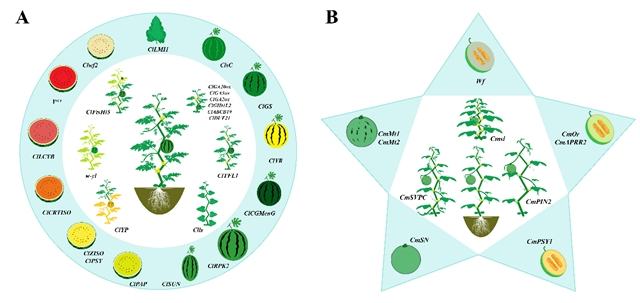 图1. 西瓜 (A) 和甜瓜 (B) 株型及果实品质相关性状的模型总结(已进行基因定位的基因)。