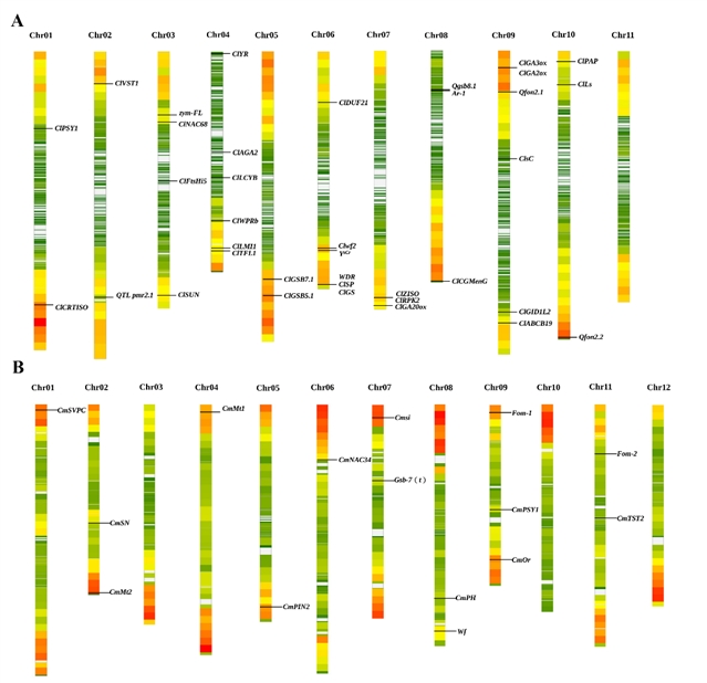 图 2. 目前已鉴定出的西瓜 (A) 和甜瓜 (B) 染色体上基因或数量性状基因座 (QTL) 的分布情况。颜色代表染色体上的基因密度。