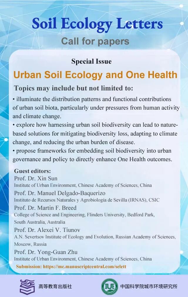 Soil Ecology Letters(SEL) 由高等教育出版社与中国科学院城市环境研究所共同主办,SpringerNature海外发行。报道领域包括:土壤生物多样性、土壤互营和食物网、土壤微生物组、土壤—植物相互作用、土壤生物地球化学循环、土壤生物修复和恢复、土壤多功能性、土壤生物对环境变化的响应和适应、土壤生态过程的突破性技术、新理论和模型。栏目包括但不限于:letter to editor, perspective, review, rapid report, research article, commentary, SEL digest。