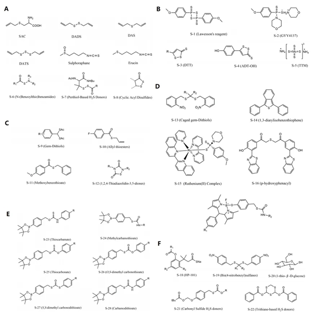 图2. A:天然H2S供体;B:水解引发的H2S供体;C:硫醇引发的H2S供体;D:光引发的H2S供体;E:活性氧引发的H2S供体;F:酶引发的H2S供体。