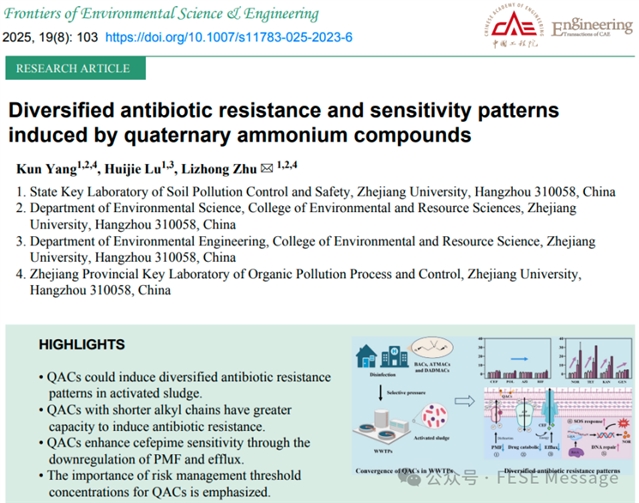 本文内容来自FESE期刊2025年第19卷第8期发表的研究论文“Diversified antibiotic resistance and sensitivity patterns induced by quaternary ammonium compounds”。通讯作者为浙江大学环境与资源学院朱利中院士。