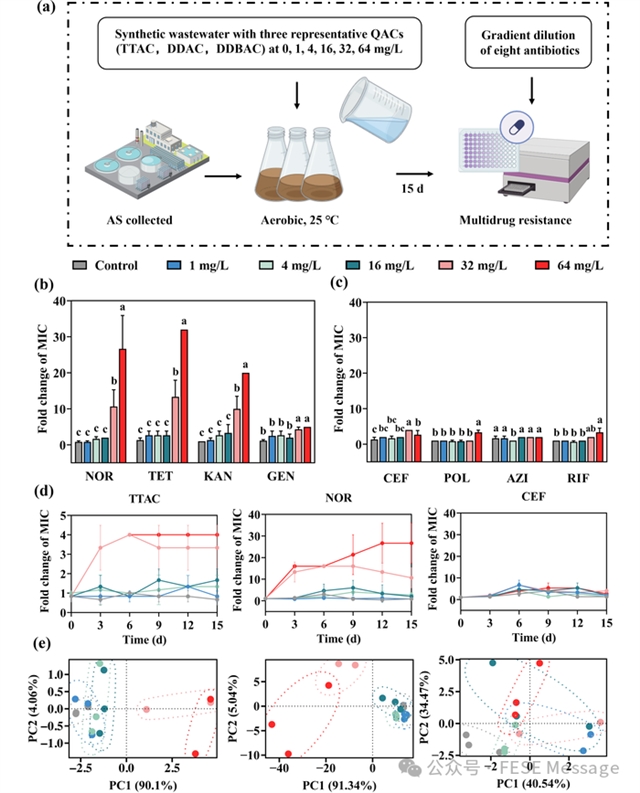 本研究选取了三种典型的QACs(十四烷基三甲基氯化铵TTAC、双癸基二甲基氯化铵DDAC、十二烷基二甲基苄基氯化铵DDBAC),对活性污泥进行15天的暴露实验。结果显示,QACs暴露使污泥对诺氟沙星、四环素等抗生素的耐药性最高提升了32倍,且呈现浓度依赖性;但对头孢吡肟、阿奇霉素等抗生素的耐药性无显著变化(图1)。时间动态分析发现,QACs自身耐药性与诺氟沙星耐药性发展趋势高度一致,均在暴露早期(第3天)显著升高并维持高位,而头孢吡肟的最小抑菌浓度(MIC)仅出现小幅度波动。