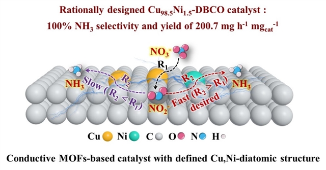 近日,中国科学院大连化学物理研究所研究员章福祥、肖建平团队,在双原子电催化剂(DACs)理性设计与构筑方面取得进展。团队基于具有优异导电性和水稳定性的金属有机框架材料(cMOF),通过对铜-镍双原子活性中心的精准调控,实现了在工业级电流密度下,接近100%选择性地高效合成氨,揭示了硝酸根电还原合成氨过程中的协同“接力催化”机制。
