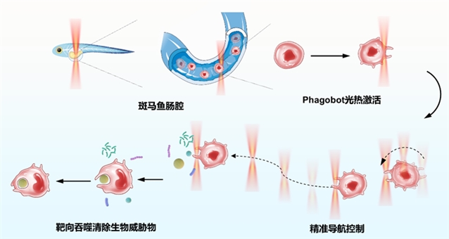 近日,暨南大学辛洪宝教授团队直接利用光来激活并控制巨噬细胞,在无需外源性材料修饰或基因编辑的条件下,通过光热-光力的双模态光控技术将天然巨噬细胞改造成具有精准导航和靶向清除功能的活细胞免疫微机器人——“吞噬机器人”(Phagobot),可在活体内外精准“作战”,实现了对病原体、癌细胞碎片等多种生物威胁的精准靶向吞噬清除。这种双模态光学调控技术通过将光学微操控技术与生物细胞功能调控结合起来,为智能生物微纳机器人的设计和构建提供了全新思路,并为免疫调控和精准医学提供了非遗传依赖的新型光学途径。相关研究成果以"Light-powered phagocytic macrophage microrobot (phagobot): both in vitro and in vivo"为题发表在国际顶尖光学期刊《Light: Science & Applications》。暨南大学纳米光子学研究院博士生李醒为本文第一作者,辛洪宝教授和潘婷副教授为论文共同通讯作者。