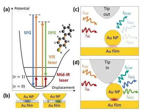 和频生成是一种二阶非线性光学过程,广泛用于表面和界面的单分子层灵敏表征。其原理是通过IR和VIS的共振激发,产生频率为两者之和的信号(ωSFG = ωIR + ωVIS),从而揭示分子振动模式和界面特性。然而,传统SFG受限于衍射极限,难以实现纳米级空间分辨率。且非线性过程的信号强度与光强的平方成正比,传统SFG需高功率脉冲激光(易损伤样品),且难以实现单分子灵敏度。