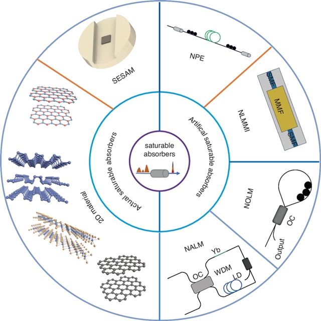 超快激光器中的非线性光学效应依赖于可饱和吸收体(SAs),它促进了脉冲的强度依赖自调幅。如图2所示,可饱和吸收体分为实际饱和吸收体和人工饱和吸收体两种。前者主要包括石墨烯、黑磷等二维材料和半导体可饱和吸收镜,虽然易于实现但面临着诸如低损伤阈值和性能随时间下降等挑战。后者是利用腔内非线性来模拟可饱和吸收体,包括非线性多模干涉(NLMMI)、非线性偏振演化(NPE)和非线性光环路镜(NOLM)等机制。