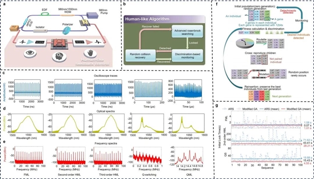 图3. (a) AML系统实验设置。(b) HLA结构图。(c-e) 从左到右,包括FML、二阶HML、三阶HML、QS和QML,每列描绘示波器走线(上)、光谱(中)和频谱(下)。图源:Optical Society of America。(f) 建议的改进遗传算法示意图。(g) 将改进的遗传算法和自动应答系统的耗时性能进行比较,虚线上的方块表示测量到的初始锁定时间,实线表示平均耗时。