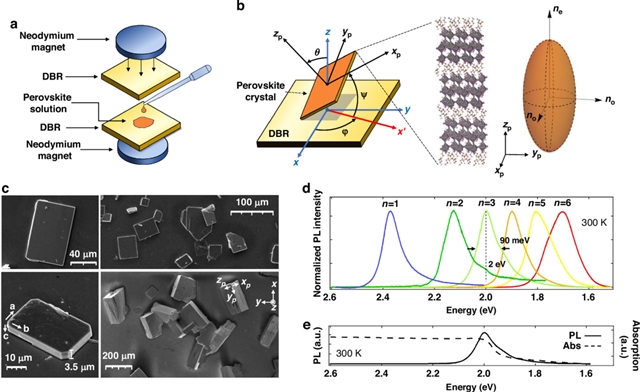 图1展示了微腔的制备流程及钙钛矿晶体的核心特性。图1a描述了微腔的制备方法:将过饱和钙钛矿前驱体溶液(成分为(BA)2(MA)2Pb3I10)滴注于加热至80°C的分布式布拉格反射镜(DBR)之间,通过磁压成型形成厚度为4–6 μm的腔体。冷却后,钙钛矿晶体在腔内自发生长并随机取向(图1b),其三维方向由欧拉角(θ, φ, ψ)定义。晶体的层状结构(图1b插图中 xp-yp 平面折射率no≈2.4,堆叠方向折射率ne≈2.9)赋予其强双折射特性(Δn≈0.5)。图1c的扫描电镜图像显示晶体横向尺寸为4–100 μm。图1d通过光致发光(PL)光谱证明:随着无机层数n增加(1至6层),激子发射峰从2.36 eV红移至1.69 eV。图1e聚焦n=3化合物,其PL发射峰位于2.0 eV,半高宽90 meV,为强光-物质耦合提供基础。