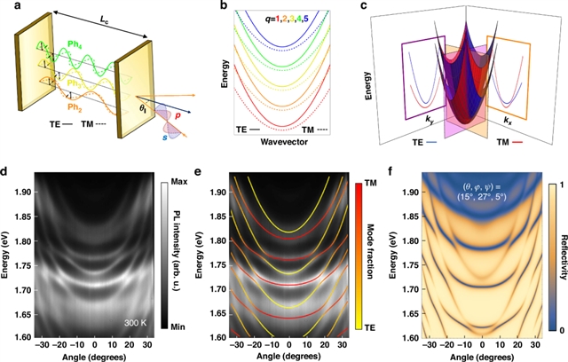 图2揭示了微腔中光子模式的相互作用机制。图2a示意了微腔支持的光子模式。图2b显示,因晶体各向异性,TE-TM分裂(偏振依赖边界条件)和XY分裂(双折射导致)共同作用,使不同偏振模式能级分离(量子数q=1–5)。图2c的理论模拟表明:沿ky轴(kx=0)时模式无耦合;沿kx轴(ky=0)时则出现显著反交叉(能隙≈20 meV),这是RD自旋轨道耦合的典型表现。实验验证见图2d:室温角分辨PL光谱观测到多个反交叉点。通过有效哈密顿量拟合(图2e)和传输矩阵模拟(图2f),确定该点晶体取向为θ=15°、φ=27°、ψ=5°,参数ax=-4.006 meV·μm、ay=2.039 meV·μm,证明RD耦合强度可调。