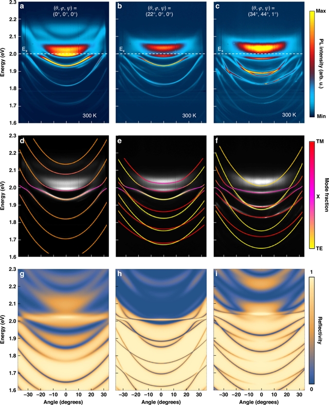 图3研究了激子-光子强耦合与RD效应的共存关系。图3a-c展示三个不同取向晶体的角分辨PL光谱:水平晶体(θ=0°):仅观测到强耦合导致的激子-光子反交叉,Rabi分裂达97 meV(图3d);倾斜晶体(θ=22°):RD耦合与强耦合叠加,反交叉能隙扩大,Rabi分裂降至64 meV(图3e);高倾角晶体(θ=34°):RD效应主导,模式分裂更显著,Rabi分裂为60 meV(图3f)。图3g-i通过传输矩阵模拟重现上述现象,并量化晶体取向对耦合强度的影响:晶体倾角越大,RD效应越强,但强耦合强度减弱。这一结果证明:通过调控晶体空间取向,可灵活平衡两种物理效应。
