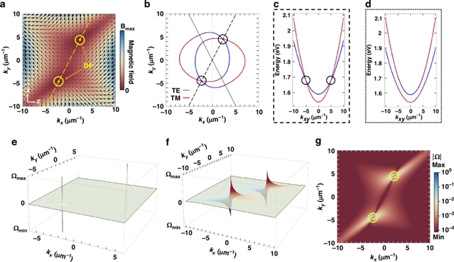 图4阐明了微腔中衍生的非平庸拓扑态。图4a计算了总有效磁场Beff(由TE-TM/XY场与RD场叠加而成),其零点对应锥形奇点(DP),位置为(kx, ky) = (±2.02, ±3.97) μm-1(图4a箭头)。图4b的色散截面显示:沿DP连线(图4c虚线),模式无耦合(能级交叉);而沿垂直方向(图4d虚线),模式反交叉(能隙2|Bz|≈20 meV)。图4e-g的Berry曲率计算表明:DP处曲率发散(Ω→±∞),且符号由动量方向决定(kx>0时Ω→+∞,kx<0时Ω→-∞)。这些结果首次在光子系统中实现:
