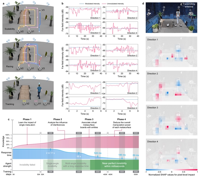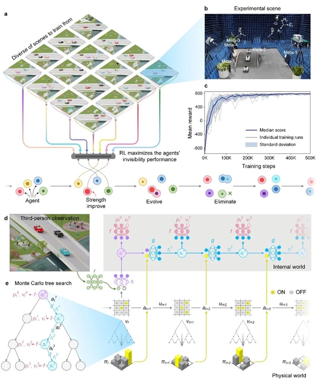 该研究的“动态消隐”能力源于两大突破:(1)超表面群体智能:通过融合可重构超表面阵列与电磁散射相消理论,建立自组织电磁拓扑网络,其核心突破在于将传统个体调控升级为分布式群体调控;(2)智能计算革命:在MuZero算法基础上进行改进,突破传统的逆向设计架构。该成果在卫星通信抗干扰、城市电磁污染治理甚至量子领域具有广阔应用前景。(来源:LightScienceApplications微信公众号)