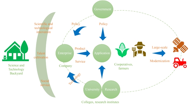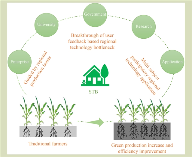 长期以来,我国农业技术推广主要依赖政府渠道,难以实现“政产学研用”融合,也无法满足农户实际需求。科技小院 (STB) 提出了一种新模式,通过高校、政府、合作社与农户的联动,将技术与政策直接落地 (图3)。以吉林省梨树县为例,STB通过优化水肥管理与密植技术,在县农技推广站的支持下,解决了限制因子,推动了土壤改良、合理群体构建与养分管理等技术的大规模应用 (图4)。STB与推广站、合作社、农户紧密合作,转变生产方式,提升产量与效益。