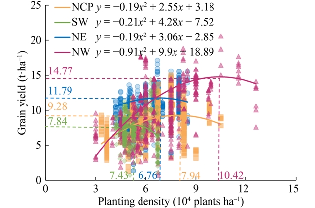 图1 不同主产区玉米的最适种植密度与最高籽粒产量。NCP,华北平原;SW,西南;NE,东北;NW,西北。