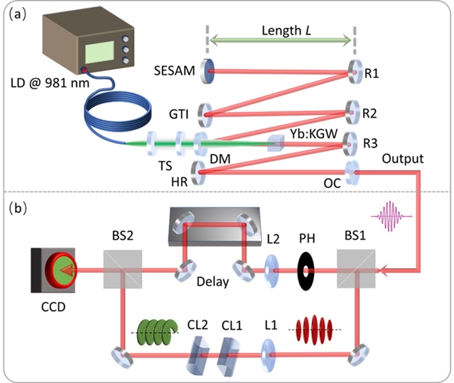 图1:实验装置简介图(a)SESAM全固态飞秒激光器(b)马赫-曾德尔干涉仪