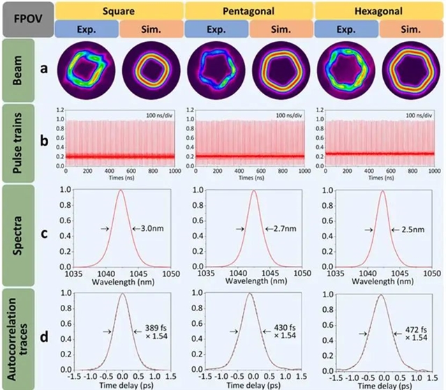 实验采用基于平移的离轴泵浦方案,通过调整泵浦光位置使激光器工作在高阶HG模式下。通过精确调整SESAM与相邻镜片之间的距离,可以改变激光谐振腔的单向传输矩阵,从而改变横纵模间隔比,使激光器工作在准频率简并QFD态。在实验过程中,随着 L 的增加,横纵模式间隔比可以实现从 1/4、1/5到 1/6 的调节,振荡器输出模式变为由多个锁相厄米-高斯模式组成的准频率简并态(QFD-HG 模式)。在此基础上,通过模式匹配和谐振腔优化,利用SESAM实现纵模锁定,从而获得具有飞秒持续时间的QFD-HG脉冲。通过模式转换器,飞秒QFD-HG脉冲被转换为具有四边形、五边形、六边形光强结构的飞秒多边形光学涡旋(如图2所示)。