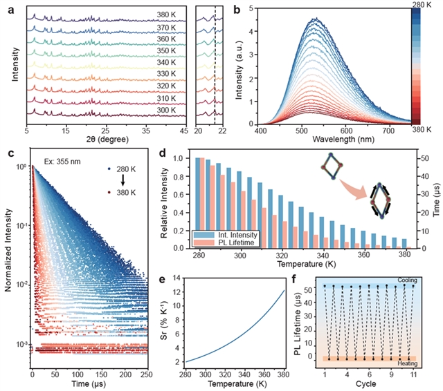 图1. (a) TPP3Cu2Br2随温度变化的XRD图;(b-d) TPP3Cu2Br2的温度依赖光学性能变化;(e-f) TPP3Cu2Br2的温度传感灵敏度和循环稳定性。